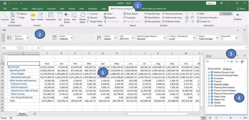 The IBM Planning Analytics tab (1) gives quick access to launch PAfE, connect to TM1 servers, and open saved reports. Once connected, the IBM Task Pane (3) and Source Tree (4) let you browse available cubes and dimensions, making it easy to drag data elements into your workbook.