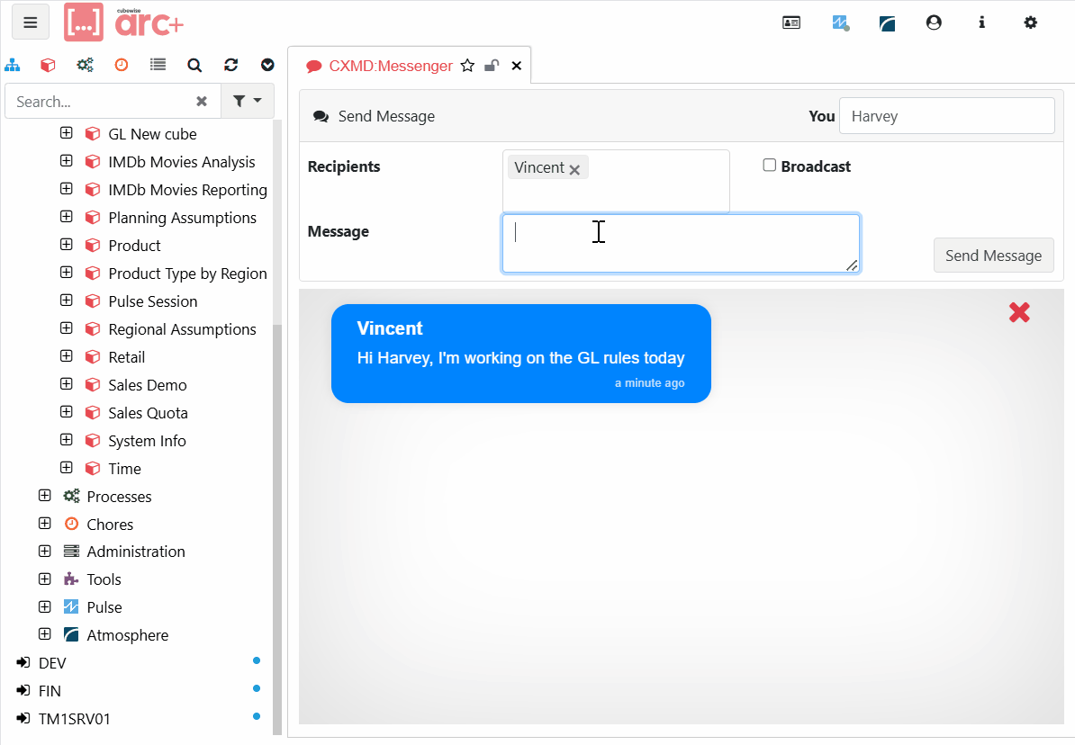 Arc now supports instance-wide broadcasts and dev-to-dev chat. This feature is great to collaborate with your team inside Arc. You can send messages to all users connected to the same TM1 instance or to a specific user. Only users who knows the messengerpassword value from the settings.yml file can send messages to all users connected to the same TM1 instance.