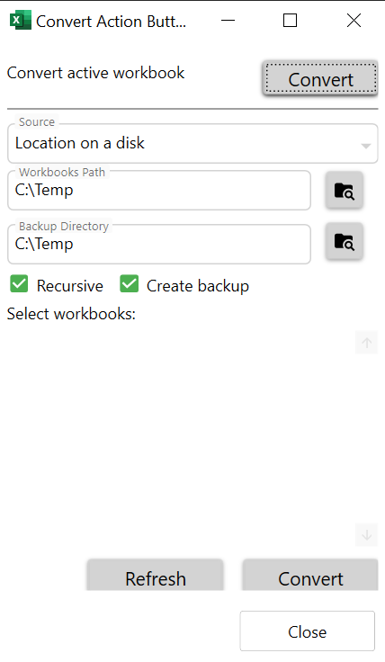 You can either convert the buttons from the Active Workbook or select a folder and convert all buttons from all workbooks.