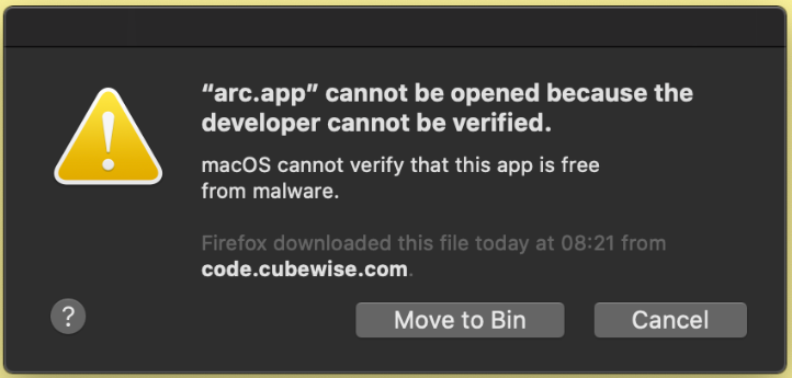 If you get prompted the following message: “arc.app” cannot be opened because the developer cannot be verified: