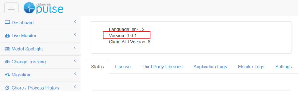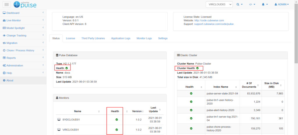 The Status tab of the Pulse About page will help you to check if all connections from Pulse to its database, the Pulse monitors, and the Elastic cluster are working.