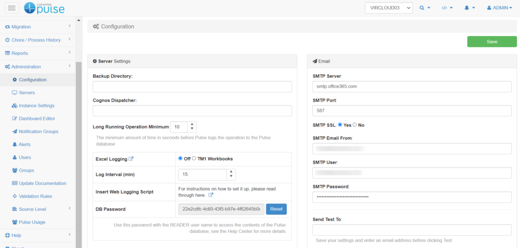 In order for Pulse to send emails when an alert is triggered, Pulse needs the SMTP server settings. Go to Pulse Configuration page and check the Email panel as below: