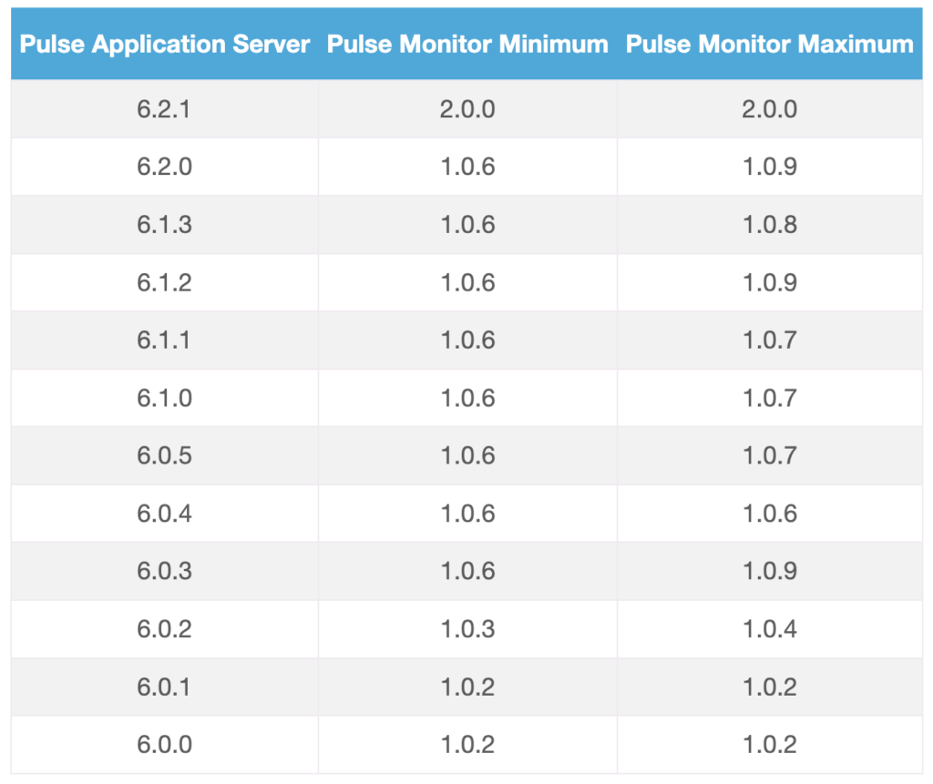 For example, Pulse Application Server v6.2.0 only works with the Pulse Monitor v1.0.6 to v1.0.9. Once upgraded to v6.2.1, you will have to upgrade the Pulse Monitor to v2.0.0.