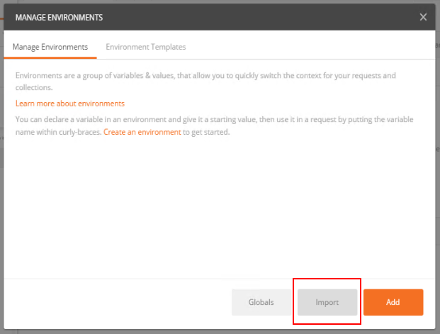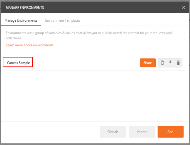 An environment in Postman enables you to save variables that you can then use in the URL. You can choose to create the environment manually or just upload the Canvas Sample.postman_environment file that you can find in the same folder you just downloaded. To import this file, go to Manage Environment: