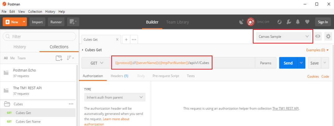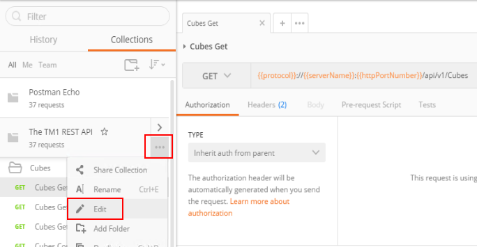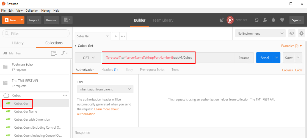 If you click on the first query Cubes Get, you will see that the URL uses parameters such as {{protocol}} or {{serverName}}: