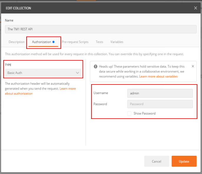 In the Authorization tab you can notice that it is set to Inherit auth from parent. Instead of defining the credentials for each query, the credentials are stored in one location, the parent folder. To update the credentials, click the edit button of the collection: