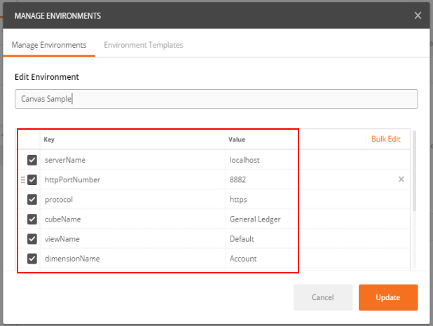 - Canvas Sample.postman_environment.json: Contains information about the TM1 instance you want to query.