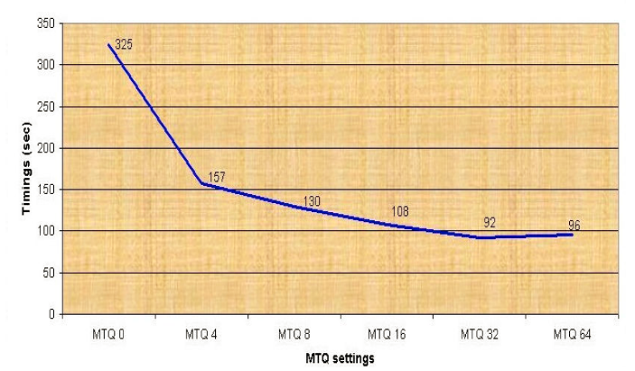 It is important to notice that an increase in cores doesn’t have a pro rata speed impact. This is attributed to the fact that the non-stargate operations associated with displaying a view still require a fixed amount of time, you can see below that after 32 you do not win lots of time:
